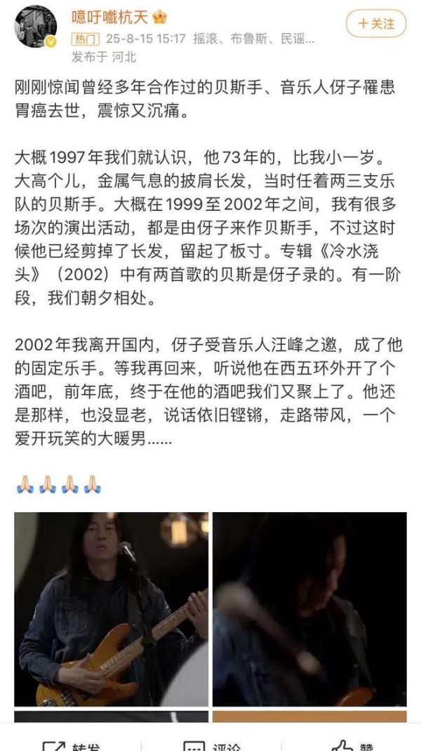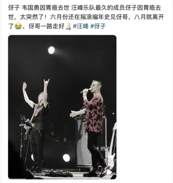 著名摇滚歌手汪峰发文悼念共事25年的好兄弟韦国勇,又名伢子,贝斯手。