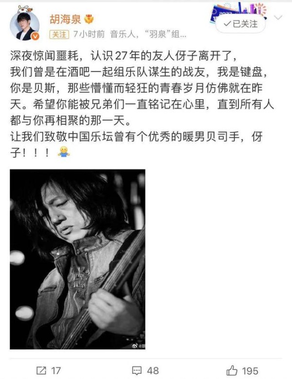 汪峰胡海泉等多名音乐人悼念他,才52岁,因胃癌永远离开大家