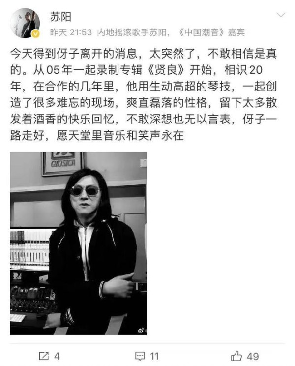 摇滚歌手苏阳也发文悼念韦国勇,他们相识20年,一起录制过专辑,在苏阳的眼里,韦国勇爽直磊落,一起有过喝酒的岁月,他是优秀的贝斯手,留下很多难忘的瞬间。