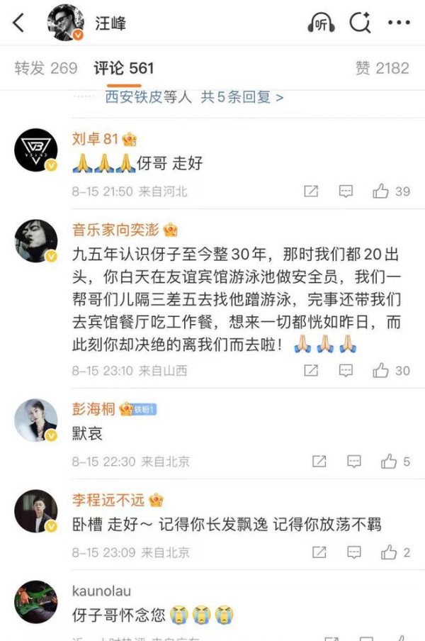 很多音乐人都在汪峰的留言区写下对韦国勇的悼念,很多人依然能够记住他们在一起的时光,那些难忘的故事,长发是他的标志,豪爽也是他的性格。
