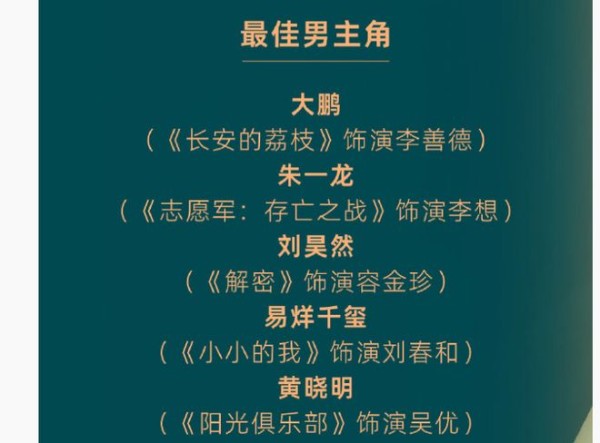在表演类奖项中,易烊千玺凭借《小小的我》第四次获得金鸡奖最佳男主角提名,朱一龙也因《志愿军:存亡之战》再次角逐影帝。