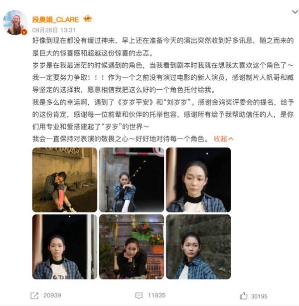 段奥娟在片中饰演被遗弃的女儿“刘岁岁”一角。得知提名消息后,段奥娟在社交平台发文坦言仍未缓过神。她表示:“岁岁是在我最迷茫的时候遇到的角色,当我看到剧本时我就在想我太喜欢这个角色了~我一定要努力争取!”