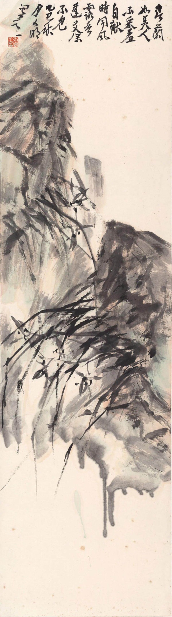 潘小明的作品发展了水墨画中的“水法”。观潘小明的兰花,除看笔墨之外,要看他的“用水”——这是他的特点,也是他最引人称道的绝妙之处。他的兰花作品中,水与墨的碰撞、分割、重组构成了一个新的有意味的水墨空间。这种水墨空间所营造出的言说图式是抽象的,内涵复杂的,在呈现出凝重、复合、动态的视觉感受的同时,又不失一种飘逸与空灵的意味。