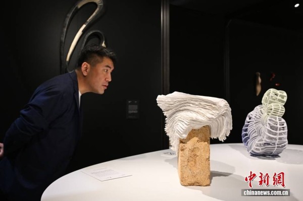 10月3日,第二十届典亚艺博(Fine Art Asia)于香港会议展览中心展览厅举行预展活动,各艺廊展示一系列古玩、珠宝、收藏设计、现代及当代艺术作品。据悉,展会将于4日至7日开放公众参观。图为现场人士参观以马为造型的陶瓷展品。中新社记者 李志华 摄