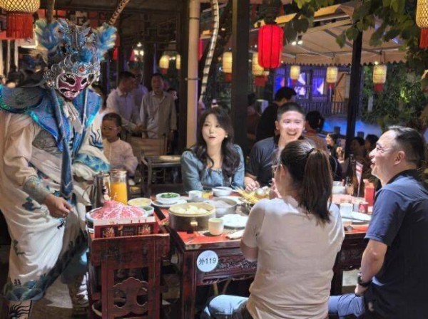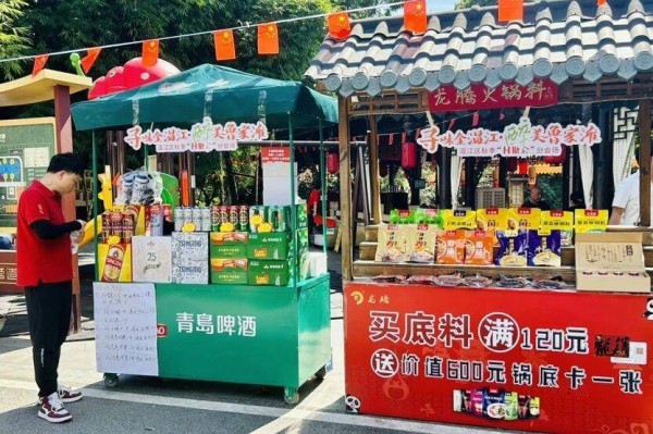 在“村糖会”期间,龙腾梵谷庄园与青岛啤酒联动,在园林式火锅环境中展示展销“温江造”啤酒,为市民游客提供微醺的温江风味。