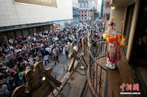 10月3日,曹禺先生经典话剧片段在天美艺术街区上演。中新社记者 孙玲玲 摄
