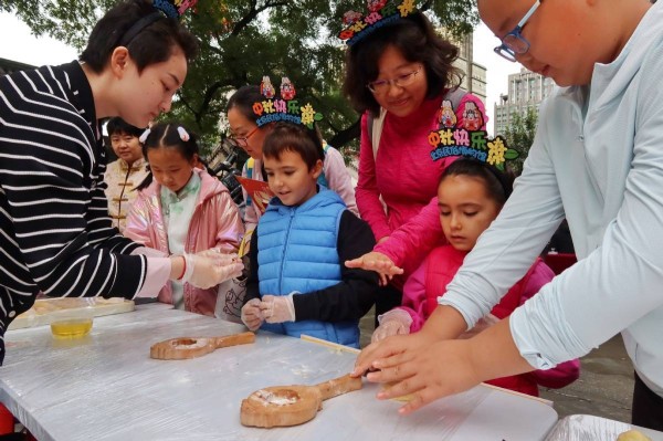10月6日,小游客学习制作月饼。中国日报记者 姜东 摄