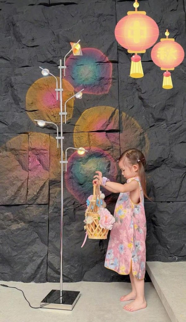 小蛋饺的个人独照肯定不能缺少,只见她光着脚穿着粉色旗袍侧面站在台阶下,旁边还放着一个有连接电源的架子,应该是放灯笼用的。