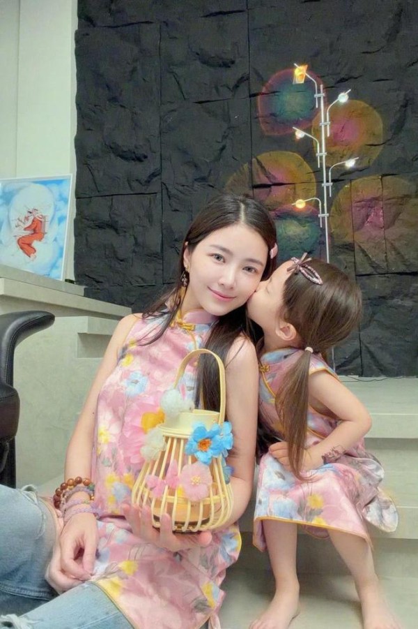 母女俩合照自然也少不了,王灿这次同样换上和女儿同款旗袍,她靠在身后的台阶处,女儿坐在台阶上,歪着小脑袋亲吻她的脸颊。