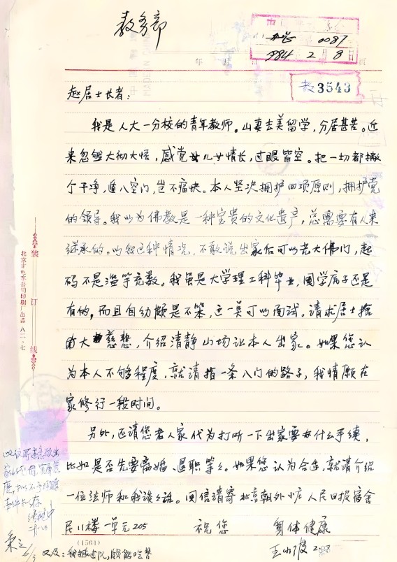 另外,还请您老人家代为打听一下出家要办什么手续,比如是否先要离婚、退职等等。如果您认为合适,就请介绍一位法师和我谈谈话。回信请寄北京朝外小庄人民日报宿舍民11楼一单元205祝您身体健康