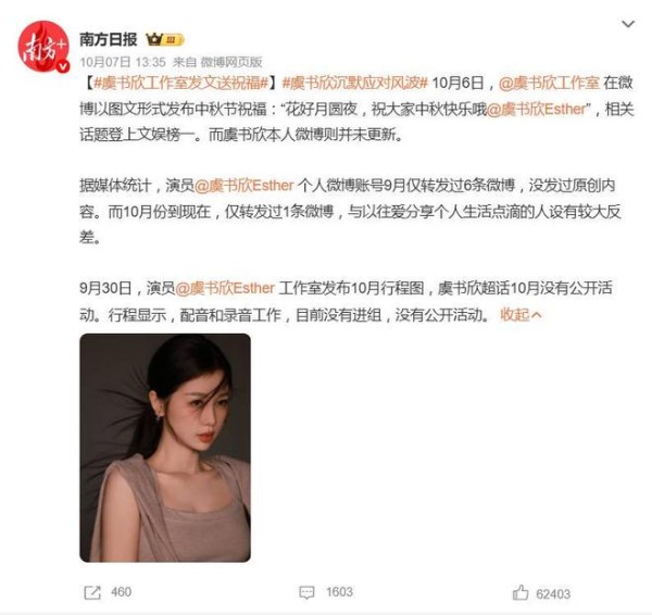 更耐人寻味的是她的内容“断档”。据媒体统计,虞书欣个人微博9月仅转发6条内容,10月至今只转发1条,与她昔日热衷分享生活点滴的“鲜活人设”形成鲜明反差。就连中秋祝福也仅由工作室以图文形式发布,本人微博一片寂静。