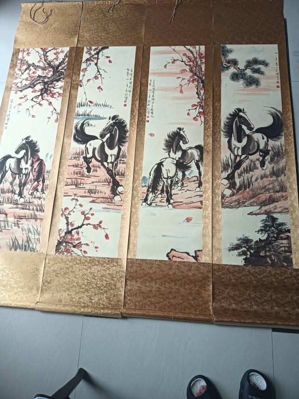 稀缺性与真品原则: 徐悲鸿的真迹,尤其是精心创作的《骏马四条屏》成套作品,在市面上面世者凤毛麟角。其作品的稀缺性,是支撑其高昂价值的根本。收藏界遵循“真、精、新”的原则,即流传有序的真迹、艺术水准高的精品、品相完好的作品,其价值最为坚挺。市场表现的稳健性: 长期以来,徐悲鸿的作品,尤其是骏马题材的精品,在国内外重要拍卖会上屡创高价,表现出极强的抗跌性和增值能力。其市场价值建立在其深厚的艺术价值和广泛的社会认同之上,而非短期炒作。文化认同的持续深化: 随着国家文化自信的增强和大众审美水平的提升,代表了中国文化精神与艺术高度的经典作品,越来越受到藏家和机构的珍视。这种深层次的文化认同,为徐悲鸿作品提供了持续而稳定的价值支撑。资产配置的优选: 在资产配置中,顶级的艺术品被视为“软黄金”。徐悲鸿《骏马四条屏》这样具有明确文化归属、高度艺术共识和稳定市场表现的作品,是高端资产配置中用于长期保值、增值的优质选择,其未来升值空间依然被广泛看好。总结而言, 徐悲鸿的《骏马四条屏》是一件集时代精神、个人才情与高超技艺于一身的艺术瑰宝。它不仅是画家个人风格的巅峰体现,更是一个民族在特定历史时期的精神呐喊。收藏这样一套作品,意味着珍藏了一段美术史,一份民族情怀,和一个永不褪色的艺术传奇。其价值,必将随着时光的流逝而愈发璀璨夺目。