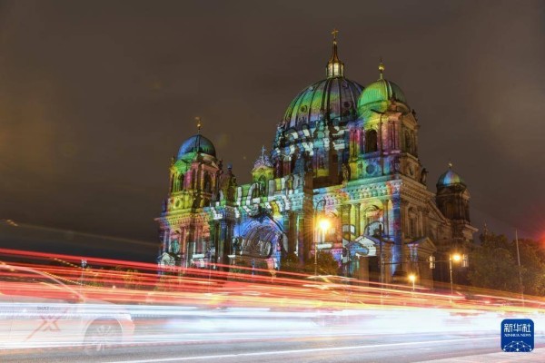 10月9日,德国柏林大教堂被灯光点亮(长时间曝光)。