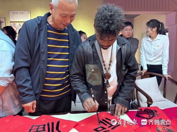 活动现场还设置了学写中国字、学说夏津方言等趣味互动环节。在书法老师的指导下,留学生们执毛笔尝试写"福""和"等汉字,在一笔一画间感受汉字书法的韵味;他们还跟着传承人学说地道的夏津方言,在欢声笑语中领略地方语言的独特魅力。
