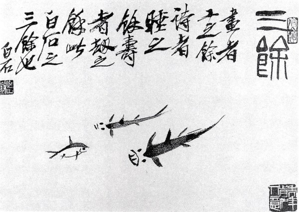 名满天下的齐白石也曾画了三条小鱼,名之曰《三余图》,这是中国的谐音妙用,“鱼”“余”同音,便假借通用。他在上面题字云:“画者工之余,诗者睡之余,寿者劫之余,此白石之三余也。”——一片闲适从容气象。