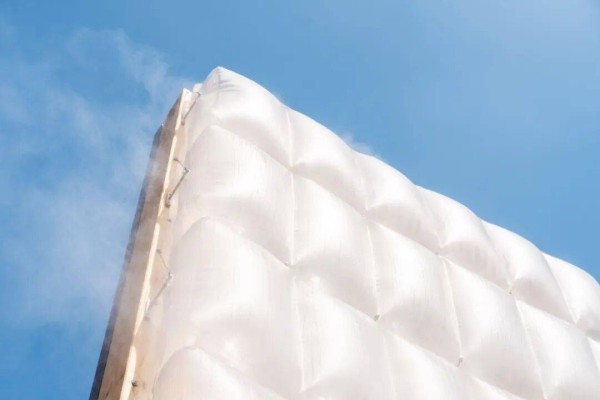 《呼吸细胞》高4.8米,宽2.4米,是MAD对未来建筑立面的一次探索,同时回应本届双年展“让城市更加人性化(Radically More Human)”的策展理念。作品提出具有生命感的城市界面的可能:在智能系统控制下,柔软的气膜建筑表皮能够感应并调节光线与温度,为建筑外的人提供舒适;控制系统待机时,材质与形态如如同巨大床垫般柔软,温暖亲和。