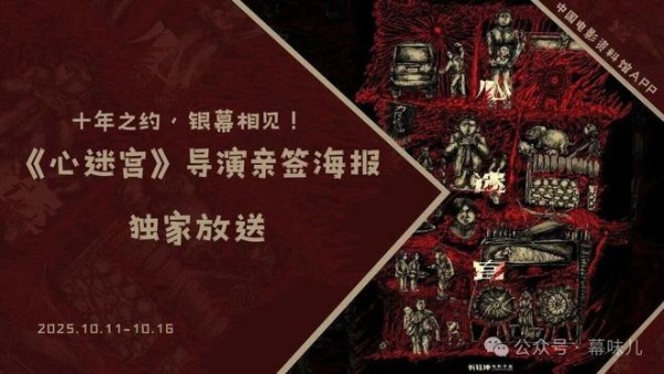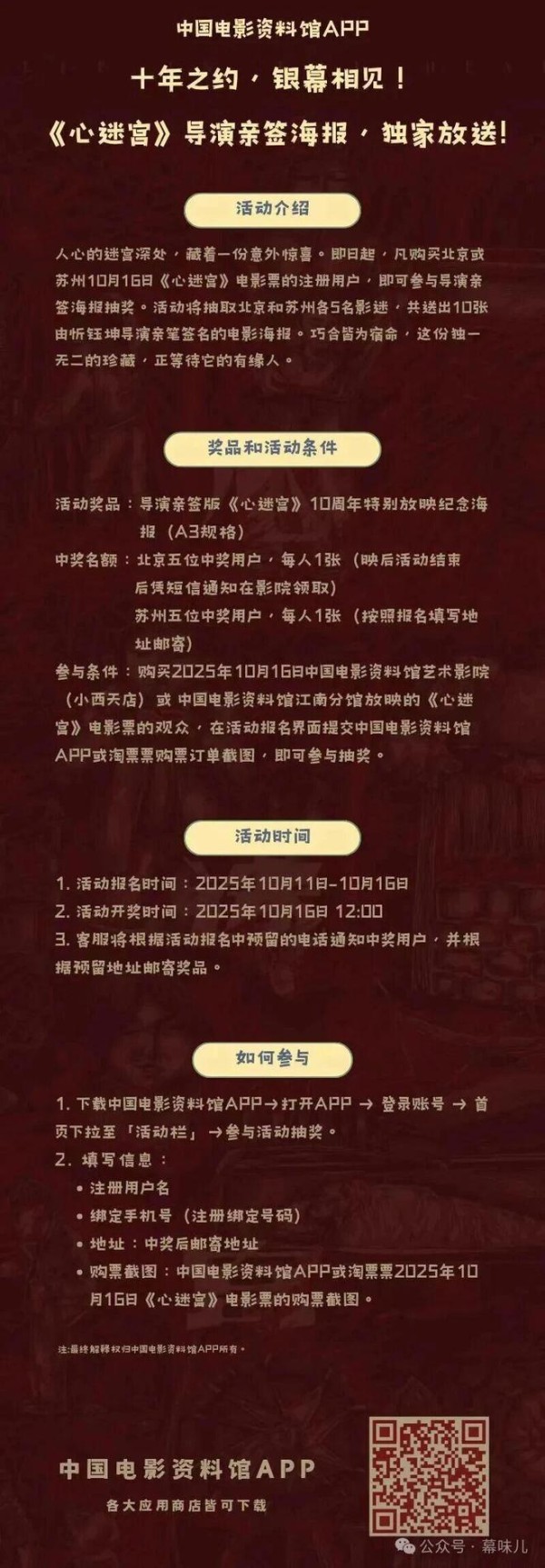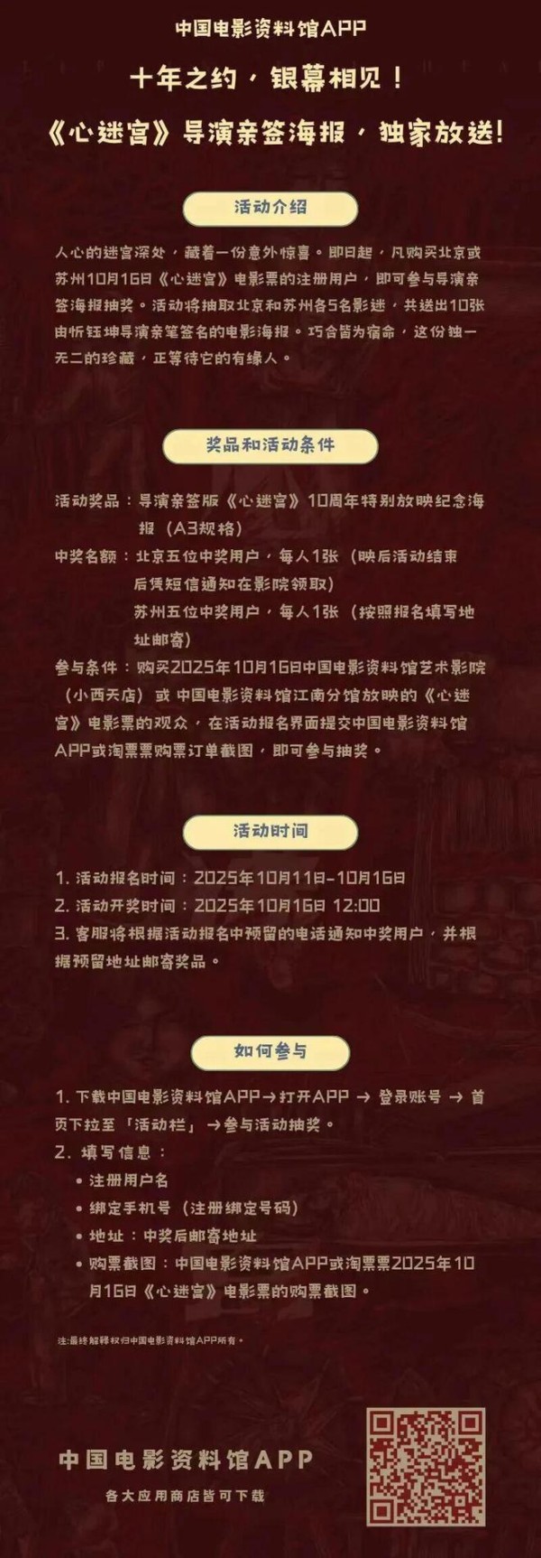 作为忻钰坤导演的电影生涯起点,《心迷宫》承载着特殊的意义。为感谢京苏两地影迷对本次活动的支持,每位到场观众均可获赠一张《心迷宫》10周年特别放映纪念海报,我们更特邀忻钰坤导演亲笔签名十张海报,作为额外惊喜送出!参与方式见次图。