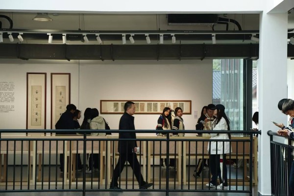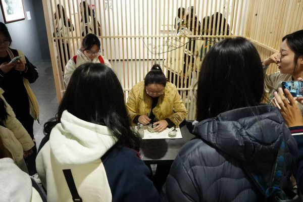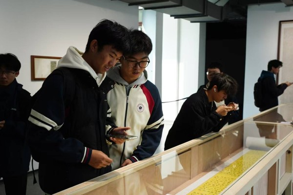 本次调研路线暗藏巧思,串联起空·美术馆、礼遇吉林·吉林省文旅商品体验馆、向北书店三大文化地标,打造“边走边学”的实践课堂。在空·美术馆,“翰墨流芳越世吉光”书画展成为新生们的“第一课”。清末至近现代的120余件名家作品,涵盖吴大澂、李叔同、傅抱石等与吉林渊源深厚的大家手笔,清晰勾勒出吉林地域书画艺术的百年脉络。新生们穿梭在现代展厅与木质展陈间,凝视《野亭消夏图》的雄浑篆意、《书法五言联》的禅意笔墨,在艺术与历史的碰撞中,读懂文化传承的温度。