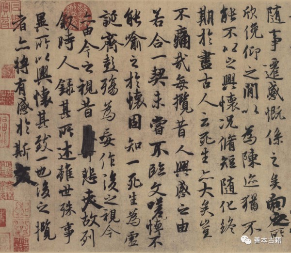 《兰亭集序》中所涂之处,在第二十五行的“良可”二字。由于用墨很浓,涂抹后的“良可”二字几乎不可辨认。综观整幅作品,这处涂抹势若崩云,给人一种“元气淋漓障犹湿”之感。王羲之借用“涂”的形式,使得作品黑白对比的处理臻于妙境。