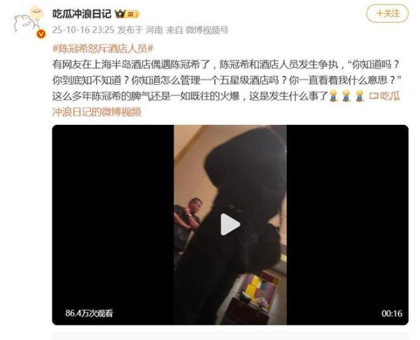 10 秒视频疯传!陈冠希上海酒店发飙,45 岁仍收不住暴脾气