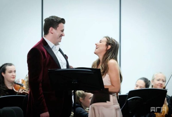 英国合奏团艺术总监、指挥哈里·毕克特,剧中男主里纳尔多扮演者阿列·努斯鲍姆·科恩和女主阿尔米莱娜的饰演者玛丽·贝文接受媒体采访(央广网记者 林馥榆 摄)