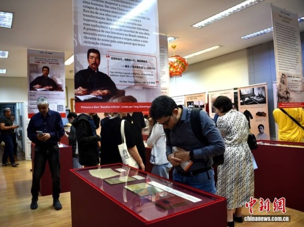 当地时间10月17日晚,由北京鲁迅博物馆、北京新文化运动纪念馆和巴西圣保罗州立大学孔子学院联袂主办的“鲁迅的文艺道路——不隔膜,相关心”展在巴西圣保罗州立大学孔子学院启幕。这是鲁迅主题展首度登陆巴西,鲁迅手稿、文集初版本、译作、美术设计、版画收藏及多语种译本等实物大量展出,展览持续3个月。图为巴西中文爱好者观展。中新社记者 林春茵 摄
