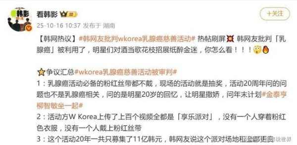 而最让公众无法接受的,是这场活动长达20年的“低效慈善”。整整二十年,累计募款额仅为10亿韩元(约合503万人民币)。这个数字,恐怕还不及当晚到场某些明星一身行头的价值,或是顶流艺人一场商演的收入。活动被曝光顾着营造高大上氛围,却从未触及乳腺癌药物保险等患者真正关心的实质议题。这也难怪大家质疑:这到底是在做慈善,还是在“作秀”?