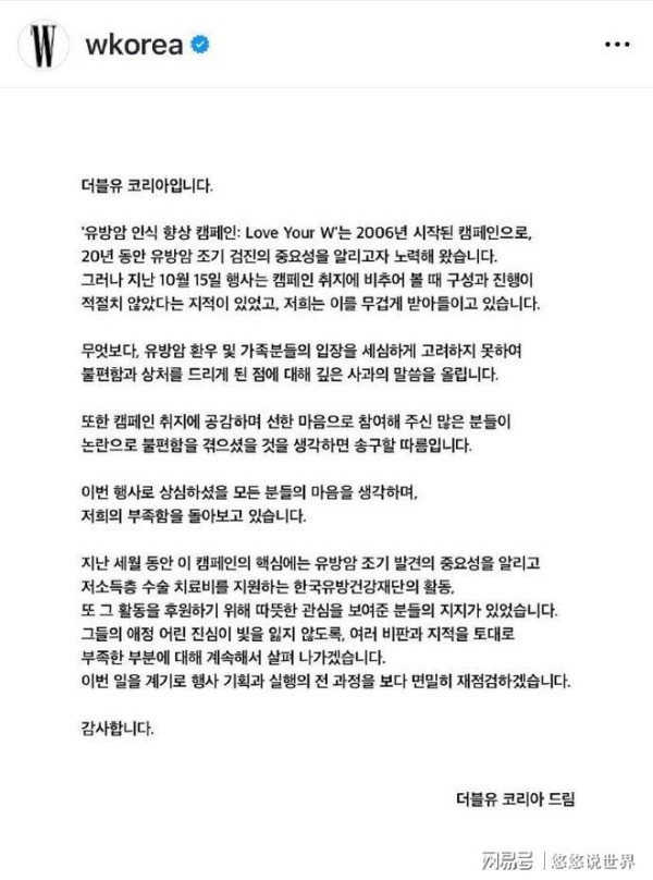 面对汹涌的舆论,《W Korea》在10月19日发布了道歉声明。声明中双重致歉:一是向乳腺癌患者及家属可能受到的伤害诚恳道歉;二是对那些怀着善意参与却感到困扰的人士表示歉意。杂志方承认了活动的根本问题——策划与执行已偏离公益初心,未能充分考虑患者立场。为此,他们承诺将删除各平台所有相关内容,全面整改,重新审查活动流程,回归“早期筛查援助”的核心目标,并接受社会监督。