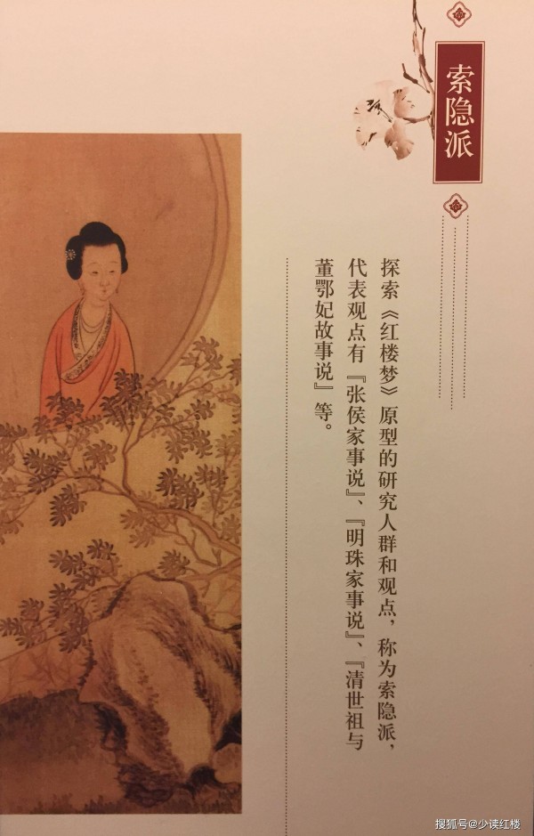 为此,红学界形成了专门的“索隐派”、“考据派”,专门研究书中人物与曹家历史或者明末历史的对应关系,且此学派近年来似乎呈现愈演愈烈之态。热衷考证的学者将目光投向书中的对联、诗句、数字、日期等等晦涩的细节,从中挖掘出大量能够证明本派观点的解读,又对更加大量的不能证明其观点的细节不予理睬。