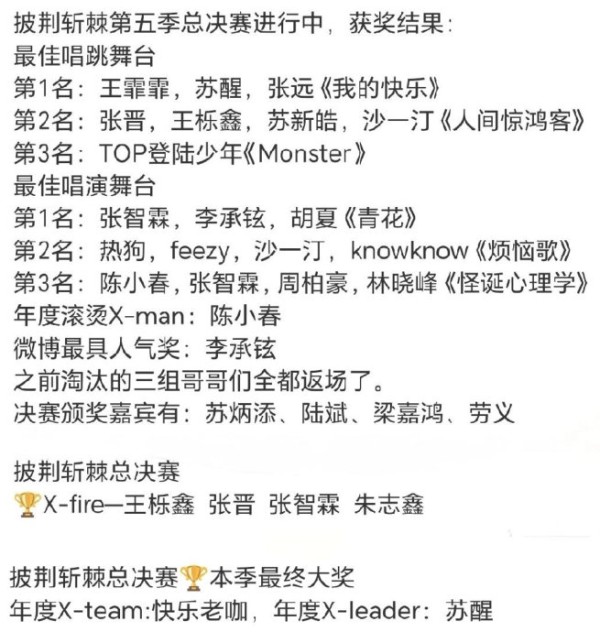 回顾整季节目快乐老咖真的贡献了超多精彩名场面,苏醒作为队长带领整个team创造好舞台,原创作品很惊艳,掌控全场的王者风范,实力、台风、表现力都是无敌了,总决赛的舞台更是巨亮眼,醒哥这个第一他值得,这份荣誉殊荣他值得