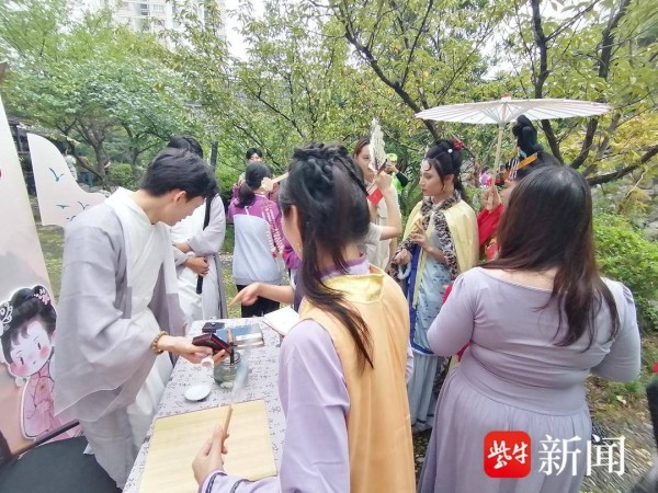 “请问贾母用的什么样的杯子喝茶?”“‘风月宝鉴’的反面是什么?”记者看到,在四位红楼角色人物的带领下,参与者们边游览锦绣园边在互动摊位上问答交流,很多问题相当“生僻”,对《红楼梦》没有相当的熟悉则难以准确回答。活动负责人介绍称,一共十二道诗谜闯关,从「竹坞清影亭」到「曲溪风荷楼」,解密可得联句诗笺,从而触发多重结局,参与者的选择将改变宝玉与钗黛的姻缘走向,“有点类似开放式结局,参与者的努力将改写结果,这个充满想象,令人期待。”