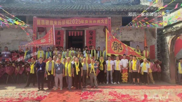 (邓氏一家亲 讯)2025年10月20日,藤县磢底朱氏宗祠举行隆重的2025年度安龙庆典,现场锣鼓喧天,祥狮欢舞,一派喜庆祥和。应朱氏宗亲盛情邀请,藤县邓氏宗亲会代表一行数十人组成庆贺团,专程前往,共襄盛举,谱写了一曲邓朱两姓团结互助的动人乐章。