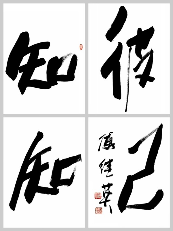 从深层次解读,“知彼知己” 是一种动态平衡的认知体系:对内,它是自我审视的镜子,让人在浮躁的世界中保持清醒,既不因一时的成就盲目自大,也不因暂时的困境妄自菲薄,在认清自身优势与短板的过程中,找到成长的精准方向。对外,它是洞察世事的窗口,引导人跳出自我局限,观察环境变化、掌握他人动态,在复杂的人际与竞争关系中,规避风险、抓住机遇。这种 “向内审视” 与 “向外探察” 的结合,正是傅继英老师书法想要传递的核心,唯有全面、客观的认知,才能让人在人生的 “战场” 上站稳脚跟。