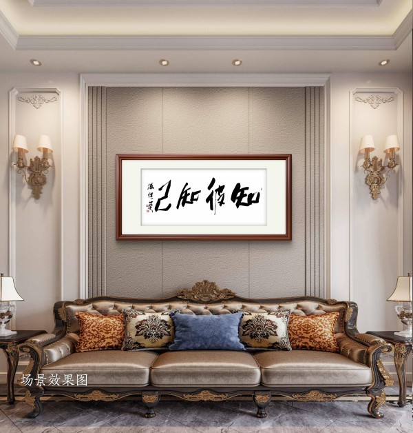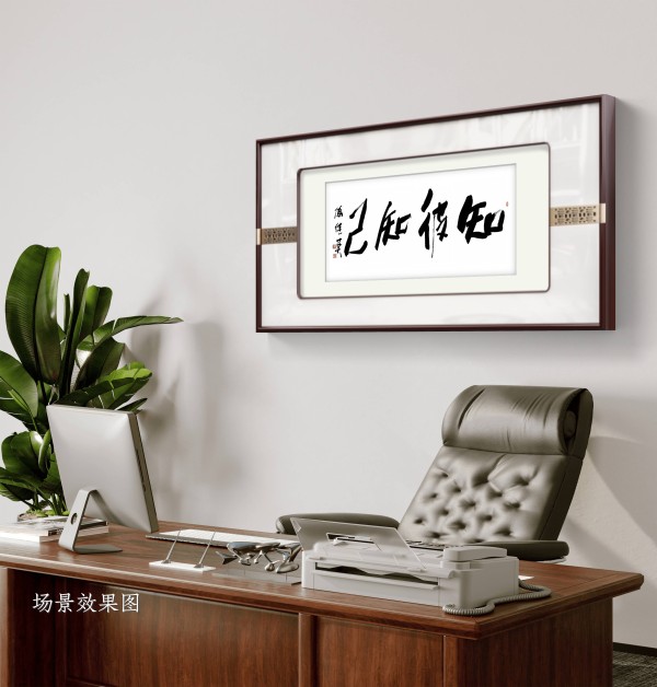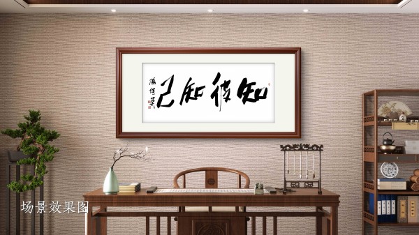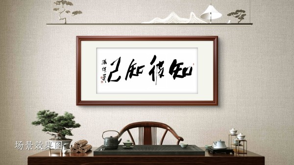 而在茶室或会客厅,这幅书法又多了几分从容的交流智慧。茶室与会客厅是与人交往的场所,“知彼知己” 在此处寓意着尊重与理解:与人交谈时,既要倾听对方的观点、了解对方的需求(知彼),也要清晰表达自己的想法、坚守自身的原则(知己),在平等的互动中达成共识、建立信任。墨香与茶香交融,文字与交流呼应,让空间更添一份人文底蕴与处世智慧。