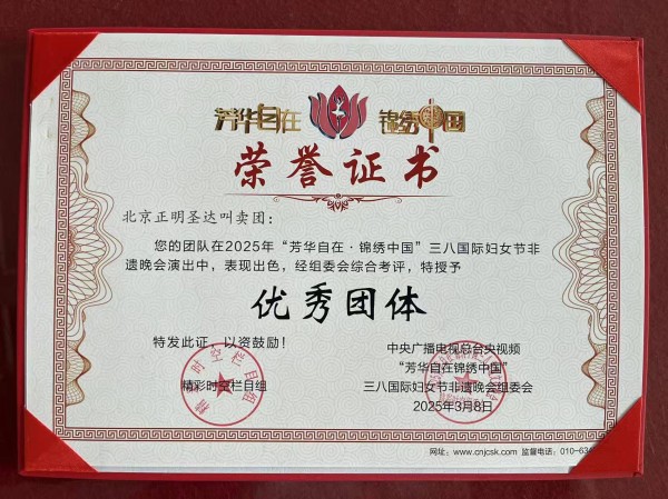 这份设计精美的荣誉证书以"芳华自在 锦绣中国"为主题,金色大字与红色边框相得益彰。证书上方绽放的莲花图案,恰如郑光荣先生表演时那一声声韵味十足的吆喝,在新时代的文化土壤中绚烂绽放。当他用纯正的方言吆喝出"冰糖葫芦儿——刚沾得哎——"时,现场观众仿佛穿越时空,回到了往昔的街巷深处。