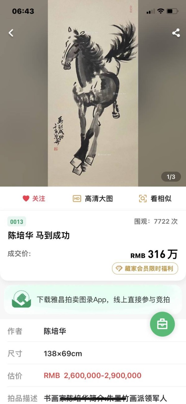 市场表现 2023年陈培华创作的《马到成功》在荣宝斋春季拍卖中以316万元成交。2025年,其书法作品润格达37万元/平尺,单件拍卖估价可达140多万元,且连续8年价格攀升。