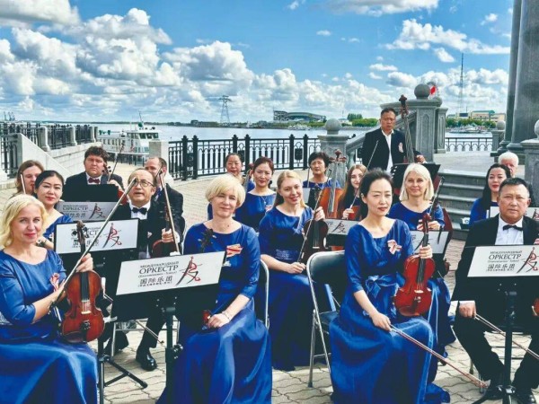 为纪念中国人民抗日战争暨世界反法西斯战争胜利80周年,中俄国际乐团在俄罗斯布拉戈维申斯克市儿童美育中心礼堂、布拉戈维申斯克市露天剧场两地演奏交响乐《歌唱祖国》《北京喜讯》《中国军魂》《格兰特船长的儿女》《我爱你俄罗斯》《再见,落基山脉》等20多首中俄经典交响曲目,现场气氛热烈。