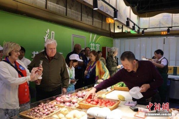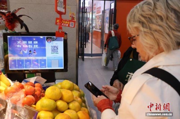 10月26日,浙江杭州,第七届中美友城大会嘉宾参观东山弄市集、中国茶叶博物馆双峰馆区、西湖、河坊街等地,感受当地的城市“烟火气”。第七届中美友城大会将于10月27日在杭州开幕。图为外籍嘉宾使用移动支付购买水果。中新社记者 王逸飞 摄