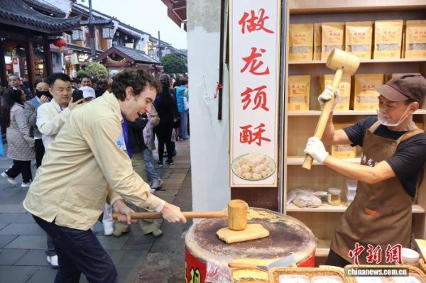 10月26日,浙江杭州,第七届中美友城大会嘉宾参观东山弄市集、中国茶叶博物馆双峰馆区、西湖、河坊街等地,感受当地的城市“烟火气”。第七届中美友城大会将于10月27日在杭州开幕。图为外籍嘉宾体验制作地方美食龙须酥。中新社记者 王逸飞 摄