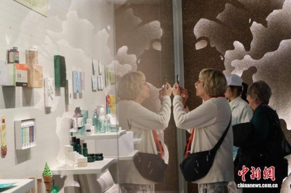 10月26日,浙江杭州,第七届中美友城大会嘉宾参观东山弄市集、中国茶叶博物馆双峰馆区、西湖、河坊街等地,感受当地的城市“烟火气”。第七届中美友城大会将于10月27日在杭州开幕。图为外籍嘉宾打卡茶叶周边产品。中新社记者 鲍梦妮 摄