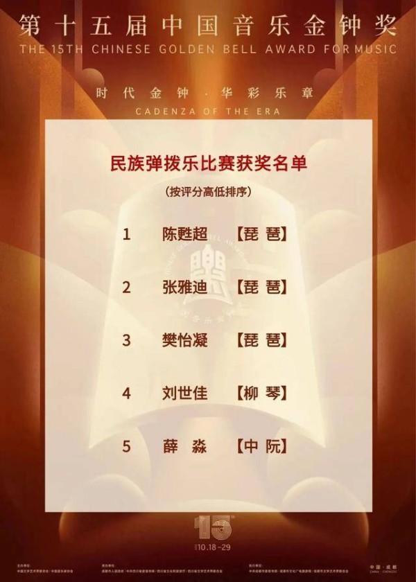 10月25日至26日,第十五届中国音乐金钟奖管乐(铜管)比赛决赛、民族弹拨乐比赛决赛、古筝比赛决赛和声乐(美声)比赛决赛圆满结束。来自四川音乐学院的夏德奇荣获声乐(美声)决赛第三名、冯奥迪荣获古筝决赛第四名。