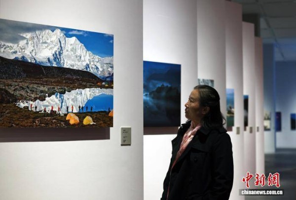10月28日,四川成都,参观者观看展出的摄影作品《静·净·境》。中新社记者 王磊 摄
