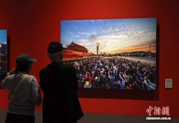 10月28日,四川成都,参观者观看展出的摄影作品。正在四川美术馆展出的第十四届中国艺术节全国优秀摄影作品展览吸引许多参观者驻足观展。该展览展出了290余件聚焦时代主题的摄影作品,为观众呈现出了一场视觉盛宴。中新社记者 王磊 摄