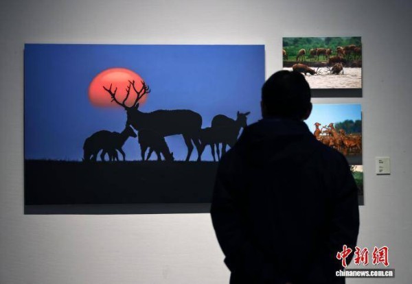 10月28日,四川成都,参观者观看展出的摄影作品《湿地鹿影》。中新社记者 王磊 摄