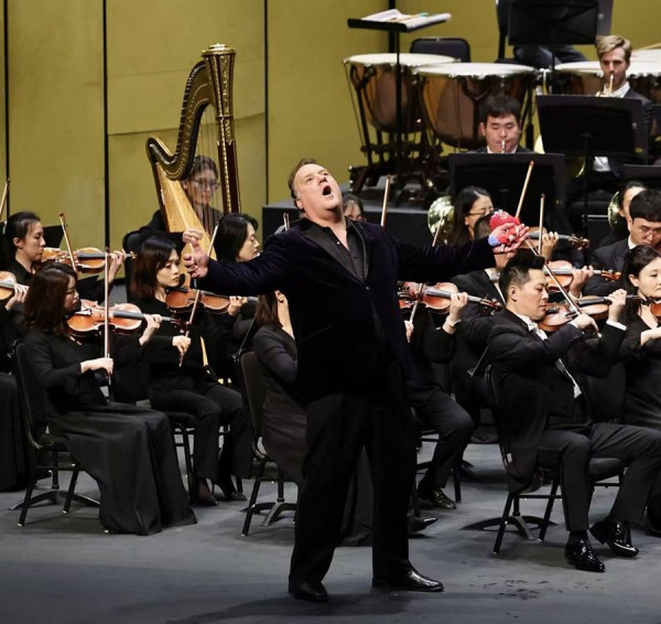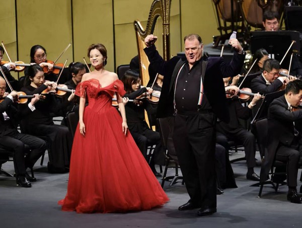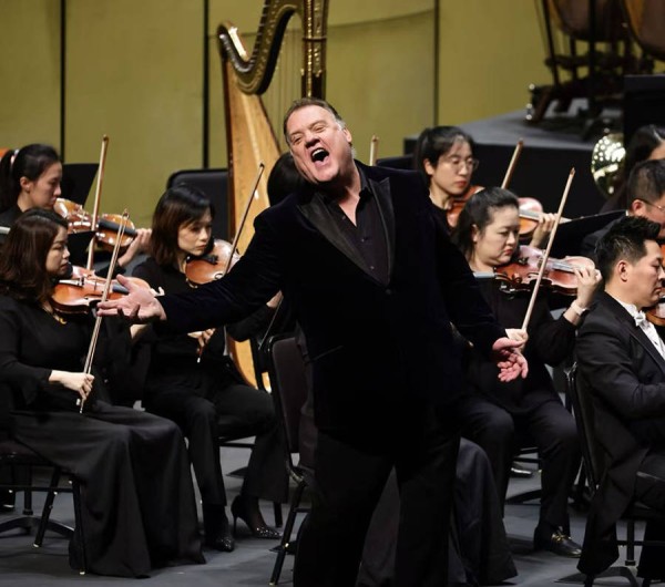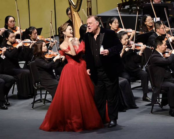 下半场,他又化身爱情使者,带有人性的微光。选自《漂泊的荷兰人》“期限已至”成为全场最震撼的一刻——他几乎不动声色,却以声音塑造出一个被诅咒的灵魂。瓦格纳式的深度与宿命感,被他演绎得悲悯而高贵。他与女高音刘艺的合作堪称教科书级别的演绎。你或许见过在舞台上喝酒,但一定未见过在舞台上喝光明牛奶——特菲尔拿着牛奶充当灵药,边饮边唱,品出了爱情的酸甜苦辣。在“迷人的夜晚”唱完后,特菲尔又即兴诉说起了自己的个人经历,把他个人和《屋顶上的小提琴手》中那个希望自己是有钱人的角色编织在一起,将全场情绪推向轻松愉悦的高潮。
