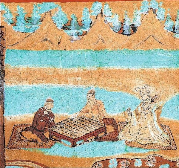 常言道:善弈者长寿。对老年人而言,保持心情舒畅是生活中极为重要的要素。下棋时需全神贯注,让人于不知不觉间忘掉生活中的烦与忧,暂且做个“活神仙”。正如唐朝诗人白居易在《旧居寄舍弟》中写道:“兴发饮数杯,闷来棋一局。”传说围棋是源自尧帝的。在西晋文人张华的《博物志》一书中就写道:“尧造围棋,以教子丹朱。”意思是说尧发明了围棋是为了亲自教给儿子丹朱。敦煌文献中存有被誉为中国现存最早围棋理论著作《棋经》,其中记录了如何将兵法战略战术巧妙应用在围棋的对弈上的策略。在敦煌壁画中亦有不少对弈的场景,且对弈的双方多为老者。在莫高窟第454窟壁画中有一幅“弈棋图”,而在莫高窟第7窟壁画中也有一幅“弈棋图”。两幅画作画面有不少相似之处:其一,画师均突出棋盘的位置,而棋盘均居中且形制相对巨大;其二,画面上的人物均为三位老者,两人对弈,一人观战,正所谓“观棋不语真君子”;其三,对弈者身后皆天朗气清,远山含黛。