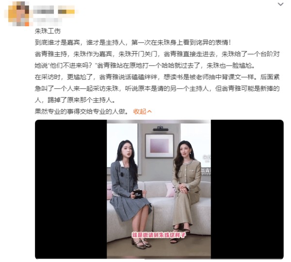 此前,翁青雅跨界担任主持采访朱珠,因一系列表现引发热议:她率先进门却未留意嘉宾朱珠仍在身后关门,被指礼仪欠妥;采访过程中说话磕绊、频繁忘词,也被质疑未做好充分准备。