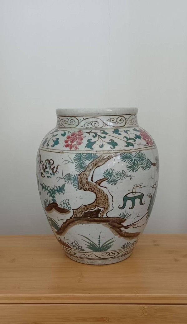 - **成型与烧制**:采用“拉坯成型”工艺,罐的器型规整度体现了明代制瓷工匠的高超技艺;二次烧成(先烧青花款识与部分纹饰,再施五彩料低温烧成),使五彩料与胎釉结合紧密,确保了瓷器的耐用性与艺术性。
