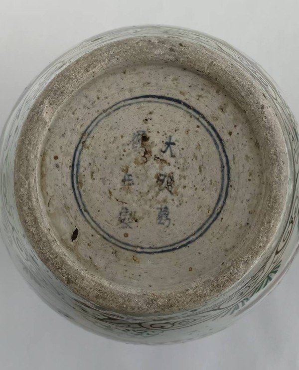 罐底清晰可见“大明万历年制”的青花款识,这是明代万历时期(1573—1620年)官窑与民窑瓷器的典型款识风格。万历时期是明代五彩瓷的鼎盛期,此时的五彩瓷以“红绿彩”为基础,色彩浓艳、纹饰繁密,既继承了嘉靖五彩的工艺特征,又在题材与装饰上更贴近民间生活,这件对弈人物纹罐便是万历民窑五彩的典型代表。