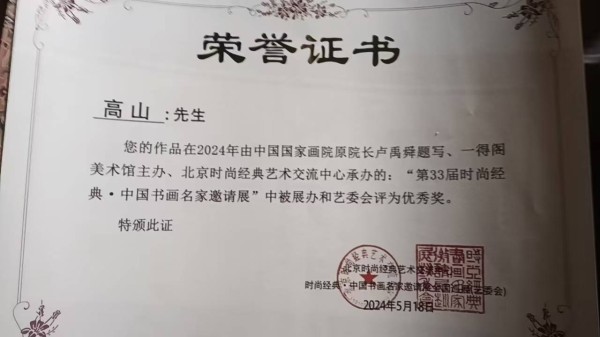 高山是当代实力派书法家,尤以篆书创作见长。他的书法根植于传统篆书经典(如《石鼓文》《峄山碑》),同时融入自身对线条、结构的独特感悟,形成了“笔法古朴、结体端庄、气韵典雅”的篆书风格。在2024年“第33届时尚经典·中国书画名家邀请展”中,其作品荣获优秀奖,这一荣誉既是对他书法技艺的肯定,也彰显了其作品在当代书画领域的艺术价值。